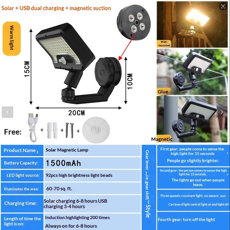 Ilumina las zonas exteriores de forma más eficiente con la lámpara de pared magnética con sensor de movimiento CCP0144 de 92 LED. Diseñada para jardines, patios, senderos, entradas de garaje, vallas, accesos y otros espacios exteriores, esta lámpara solar combina detección inteligente de movimiento, instalación flexible y una estructura resistente a la intemperie en una solución de iluminación práctica. Su conjunto de 92 LED proporciona una iluminación brillante cuando más la necesitas, lo que ayuda a mejorar tanto la visibilidad como la seguridad exterior.