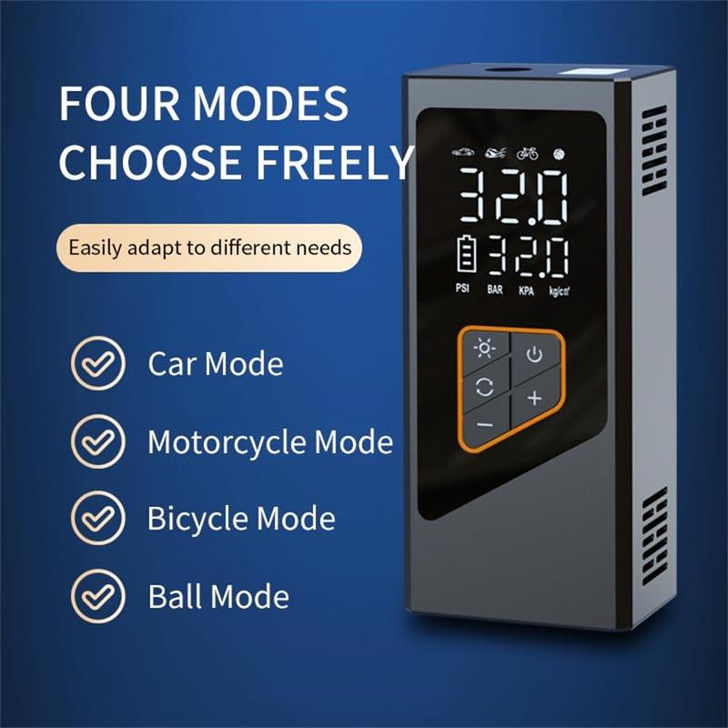 - Modos de inflado preestablecidos - Ofrece 5 modos de inflado preestablecidos para diferentes necesidades: Coche 26-50 PSI, Moto 26-45 PSI, Bicicleta 30-65 PSI, Balón 4-16 PSI, Modo Libre 5-150 PSI para ajuste manual.