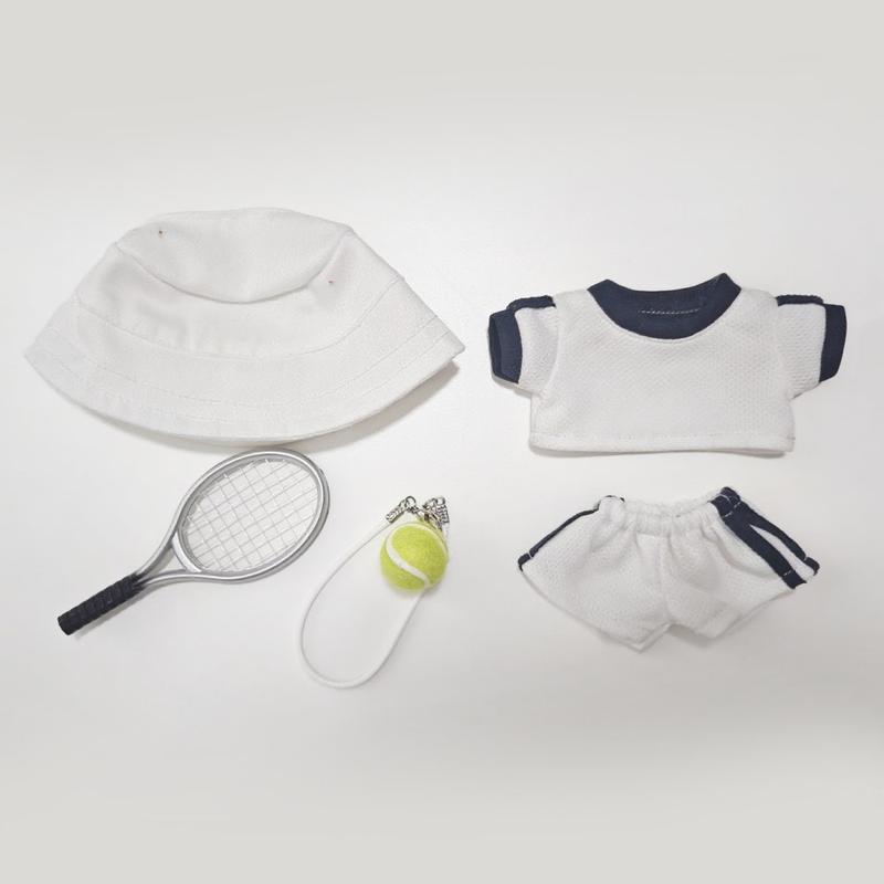 • Conjunto de Tenis para Muñeca Labubu 17cm - 5 Pzs. - Camiseta, Pantalones cortos, Gorra, Raqueta de tenis, Pelota de tenis Charm