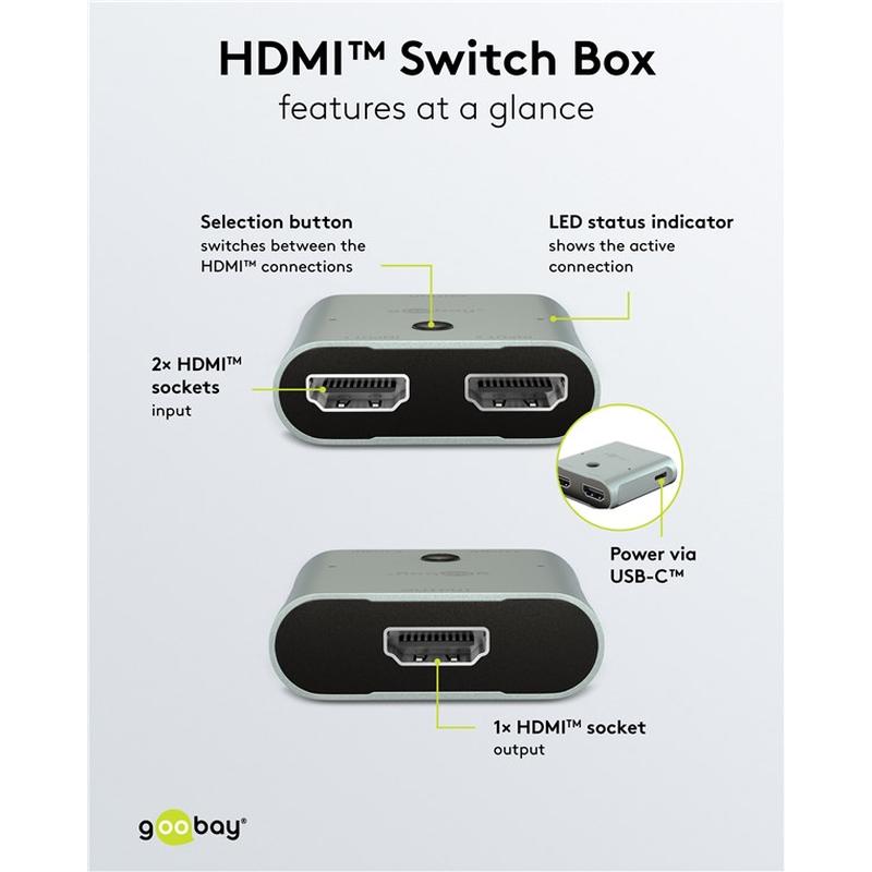 El conmutador HDMI 2 a 1 de Goobay te permite conectar 2 dispositivos HDMI a 1 televisor, monitor o proyector y cambiar entre ellos con facilidad. Compatible con hasta 8K a 60 Hz, 3D, HDCP y alimentación USB-C, es un práctico selector HDMI para consolas, portátiles, reproductores de Blu-ray y modernas configuraciones de entretenimiento doméstico.