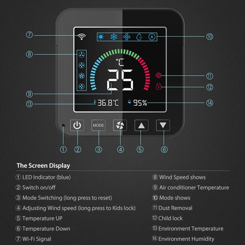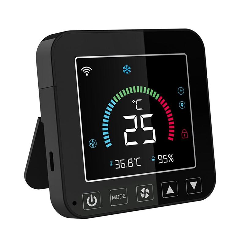 Este controlador inteligente cuenta con una pantalla LED a color con retroiluminación, lo que facilita comprobar los ajustes y las condiciones interiores de un solo vistazo. Los botones sensibles permiten un funcionamiento diario fluido, mientras que el diseño moderno se integra de forma natural en una amplia gama de interiores. Tanto si desea supervisar el clima de la habitación como ajustar rápidamente su configuración, la pantalla ofrece una experiencia sencilla y fácil de usar.