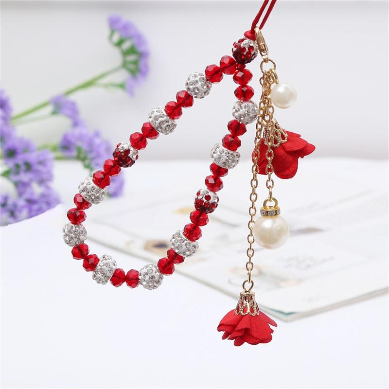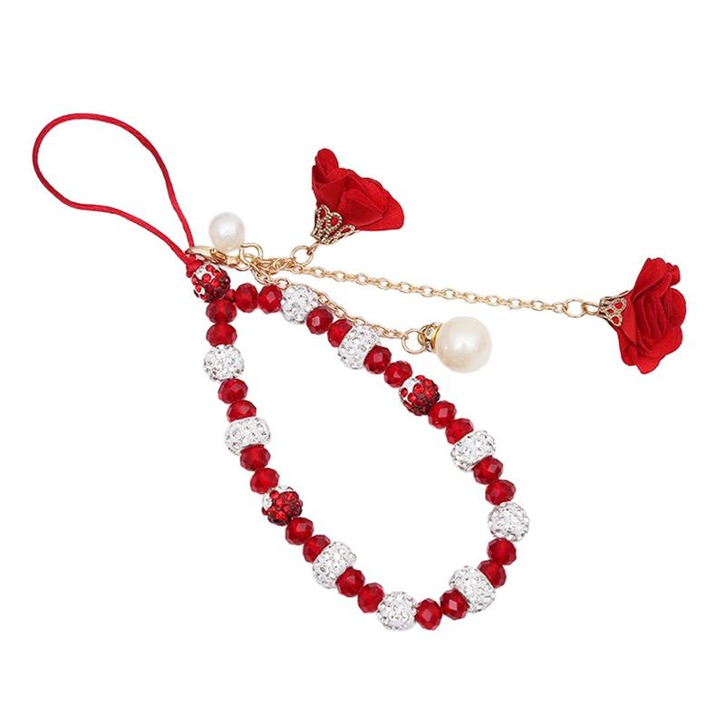 Cordón para móvil con dijes de rosa y cuentas de cristal - Rojo