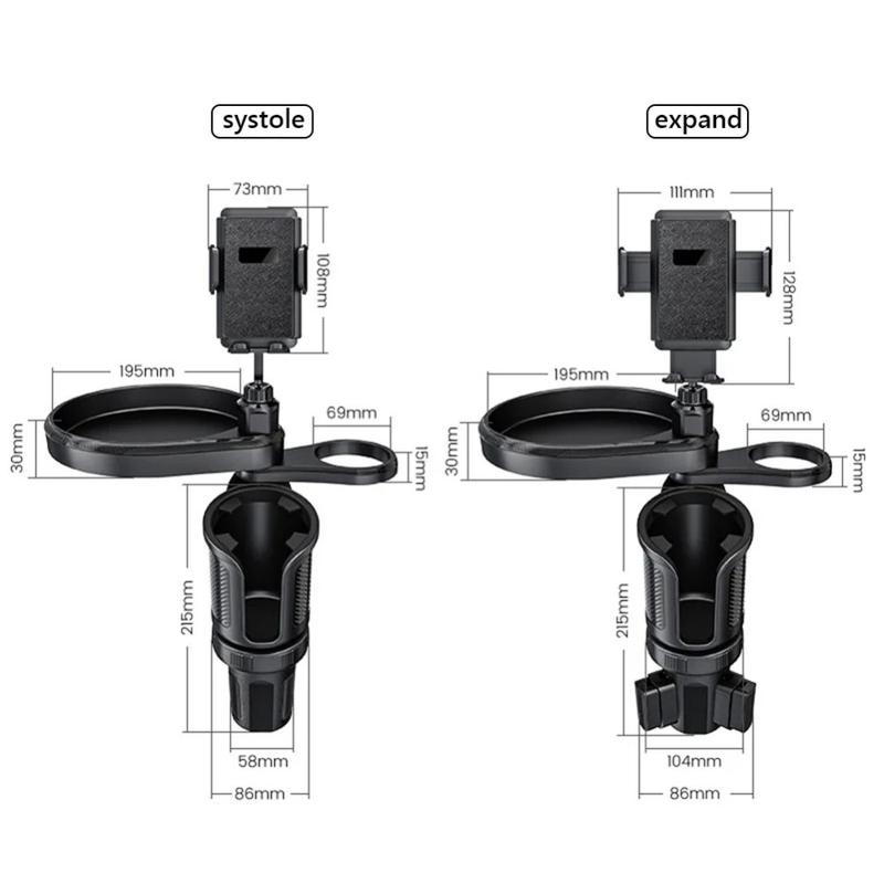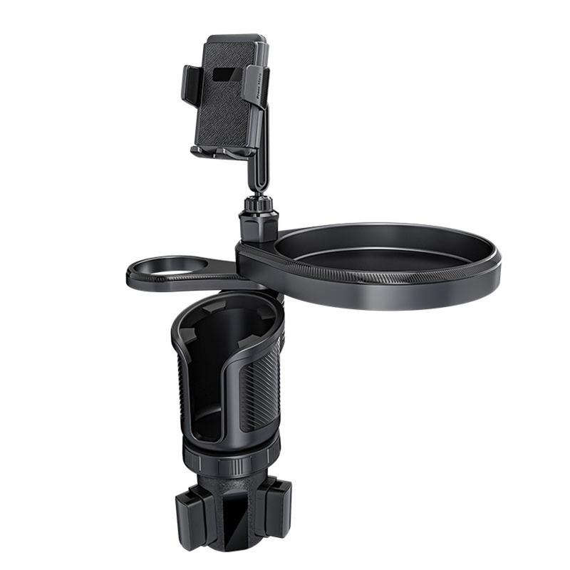 - Diseño multifuncional 4 en 1: Combina un soporte para teléfono, una bandeja, un portavasos para bebidas y un compartimento para tazas en un accesorio compacto y funcional.