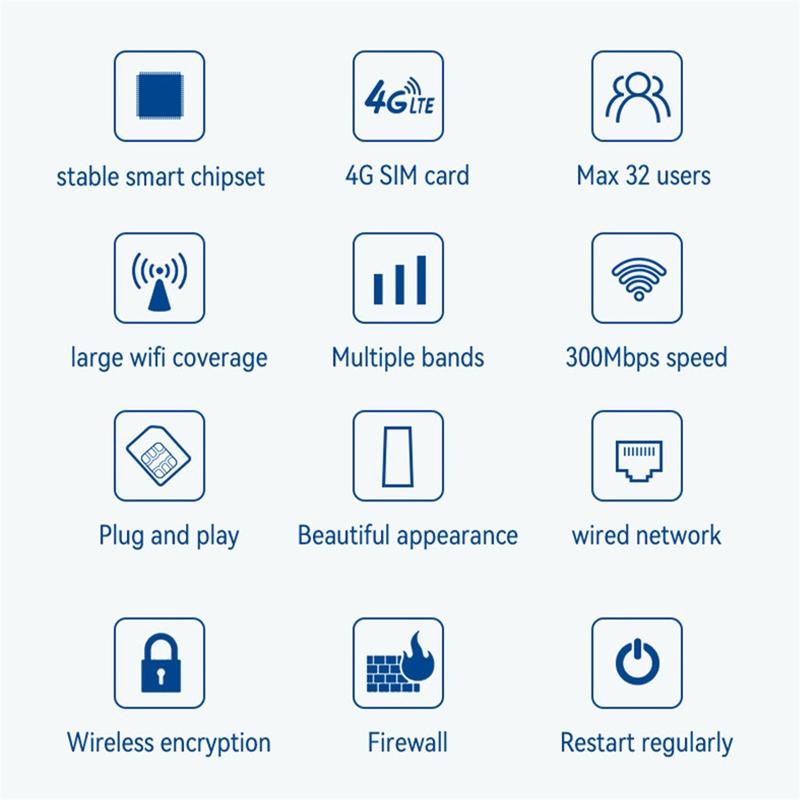 Convierte tu señal 4G en un hotspot Wi-Fi con un alcance de cobertura de 20-30 metros. El router admite hasta 32 dispositivos simultáneamente, por lo que es ideal para hogares, oficinas pequeñas y espacios compartidos.