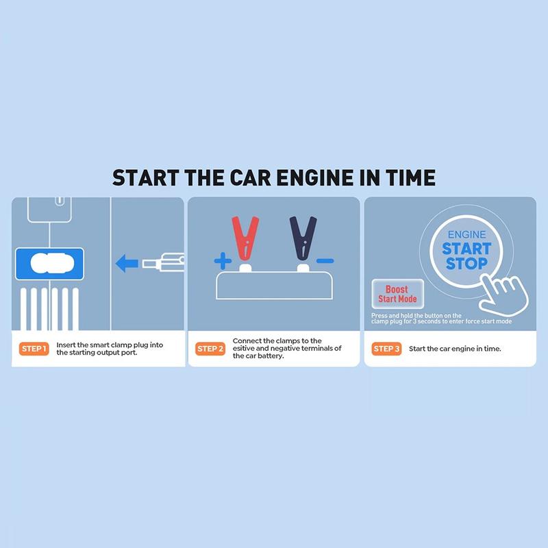 Con una corriente máxima de hasta 4000 A, el CY97 está diseñado para ayudar a arrancar vehículos de gasolina y diésel de 12 V de forma rápida y segura. Es compatible con vehículos de hasta 6,0 L de gasolina y 2,0 L de diésel, lo que lo hace útil para muchos coches y vehículos más pequeños. El sistema de protección inteligente ayuda a mejorar la seguridad durante el uso al proteger contra problemas como la conexión inversa, la sobrecorriente, el sobrecalentamiento, la sobrecarga y los cortocircuitos.