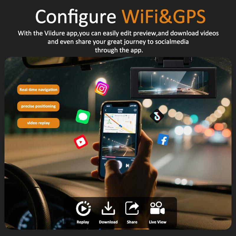 La conexión Wi-Fi integrada le permite conectar la dash cam directamente a su smartphone para reproducir, descargar o compartir archivos de vídeo al instante, sin necesidad de extraer la tarjeta de memoria. El módulo GPS integrado realiza un seguimiento de las rutas y ubicaciones de conducción, proporcionando datos cartográficos precisos para la documentación del viaje o la verificación de accidentes. La asistencia al conductor ADAS añade una capa adicional de seguridad con alertas inteligentes que ayudan a promover una conducción más prudente.