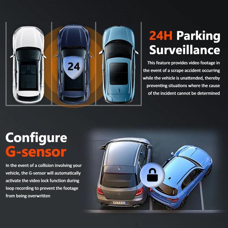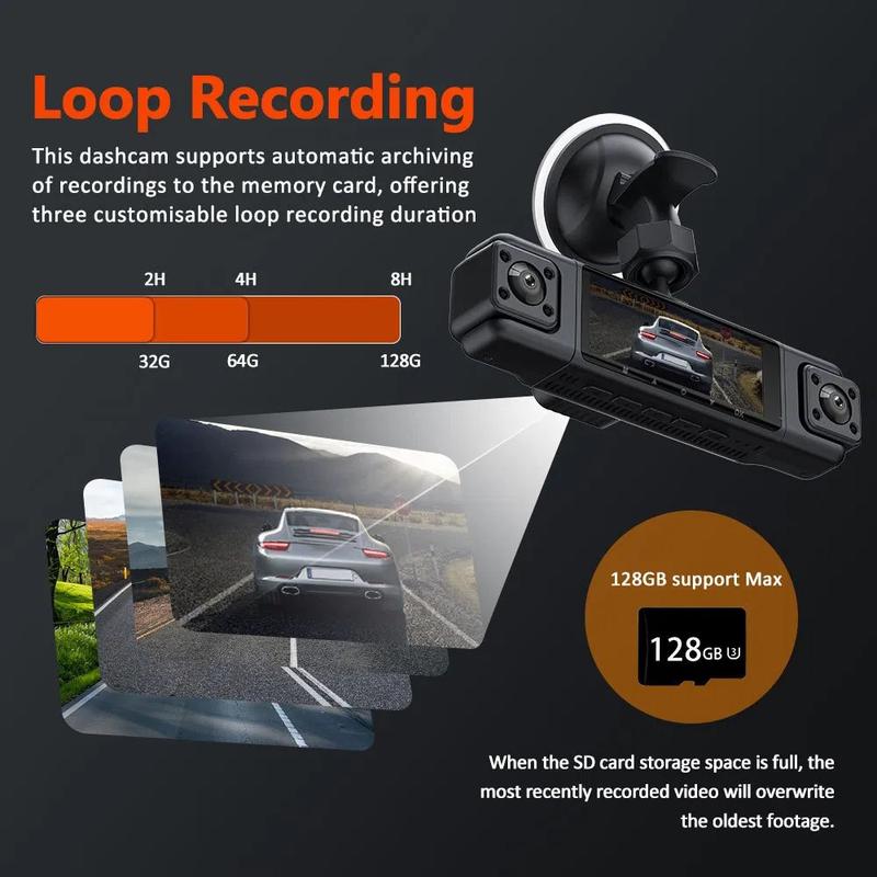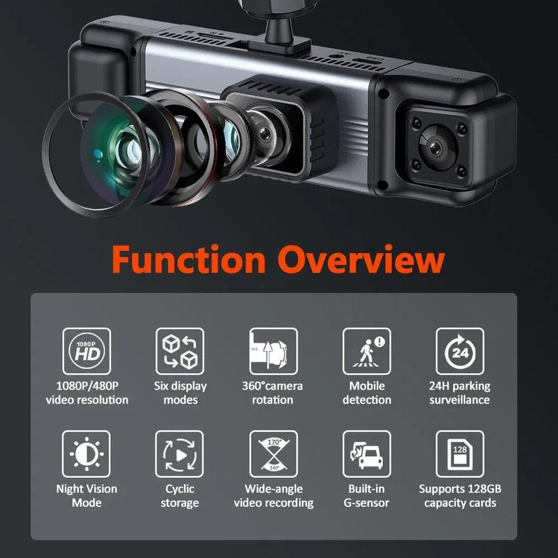 Manténgase seguro y totalmente protegido en la carretera con esta dash cam con pantalla IPS de 3.0" y 4 lentes, diseñada para grabar su viaje con una claridad excepcional. Con una cámara frontal de 1080P y tres lentes laterales y traseras adicionales de 480P, ofrece una cobertura completa para una conducción más segura y confiada.