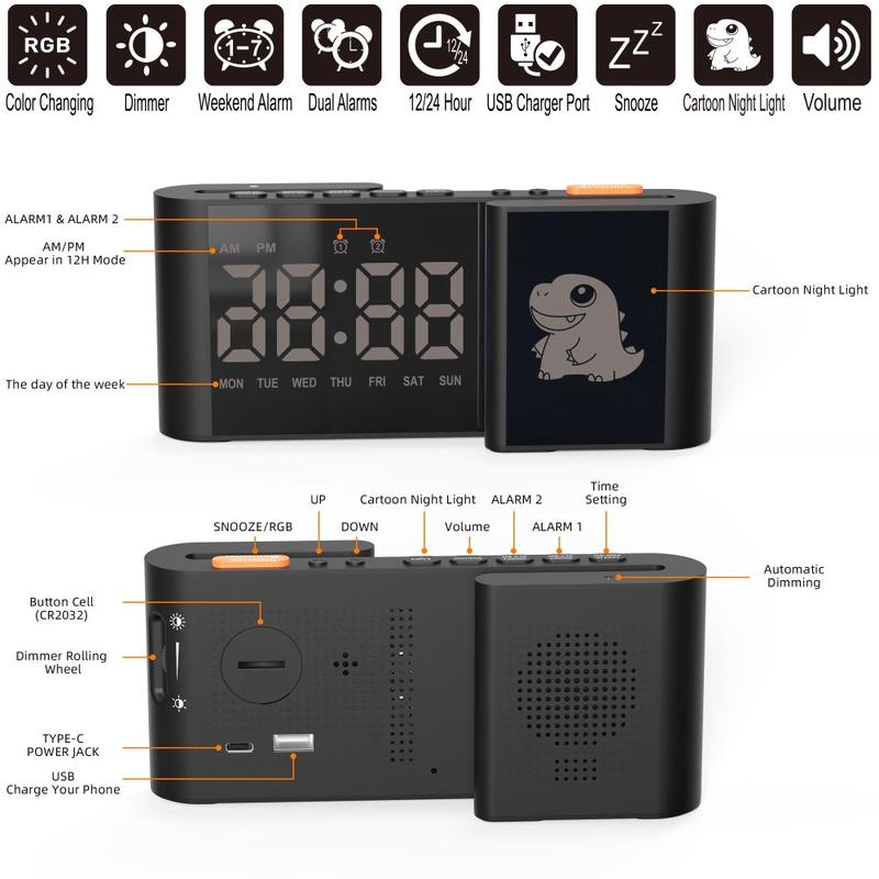 Reloj despertador para niños con pantalla doble, 12/24 horas, luz nocturna y dibujos animados RGB en forma de S
