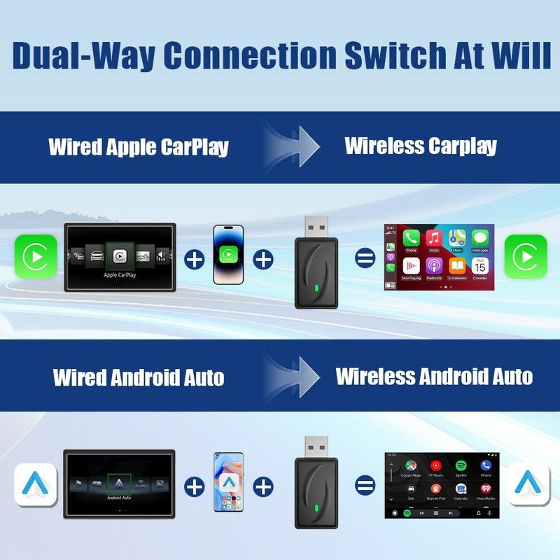 Mejora tu coche con el adaptador inalámbrico 2 en 1 para CarPlay y Android Auto, que convierte las conexiones por cable tradicionales en experiencias inalámbricas sin interrupciones. Disfruta de más libertad, menos desorden y una conducción más segura, todo ello sin cables enredados.
