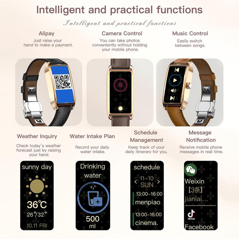 Mantente organizado y conectado con una serie de herramientas inteligentes: Compatibilidad con Alipay, control de música, cámara remota, alertas por vibración, notificaciones de mensajes, actualizaciones meteorológicas, recordatorios de hidratación y gestión de horarios. Diseñado específicamente para mujeres, también incluye seguimiento del ciclo menstrual y atenuación de la pantalla en modo nocturno para disfrutar de noches tranquilas.