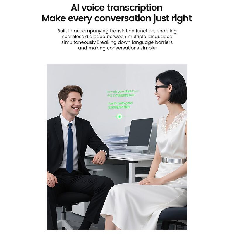 Las gafas inteligentes como las E02 utilizan el reconocimiento de imágenes por IA y la traducción en tiempo real para salvar las distancias de comunicación al instante. Su doble función de gafas con cámara y dispositivo de audio inalámbrico las convierte en un gadget futurista todo en uno para la productividad y el ocio.