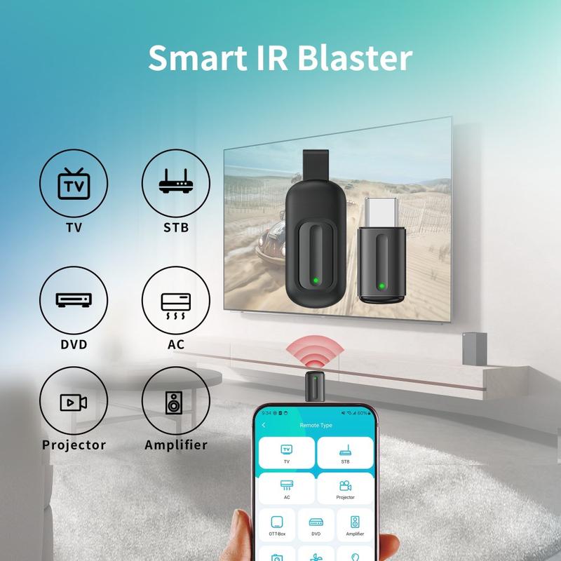Sin pilas, sin carga y sin restricciones específicas de aplicaciones: basta con conectar el adaptador al puerto Lightning/Tipo-C de su dispositivo y disfrutar de un control inmediato sobre los dispositivos electrónicos domésticos basados en infrarrojos.