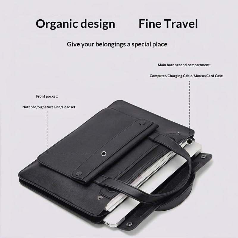 Esta bolsa tipo tote para portátiles de 13,3" y 14" está diseñada para usuarios que buscan una forma más ordenada, organizada y elegante de llevar consigo sus objetos esenciales de uso diario. Con su elegante estructura inspirada en el acordeón, su práctica distribución en múltiples compartimentos y su acabado profesional de poliuretano, resulta ideal para los desplazamientos diarios, el uso en la oficina, las reuniones, el estudio y los viajes.