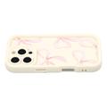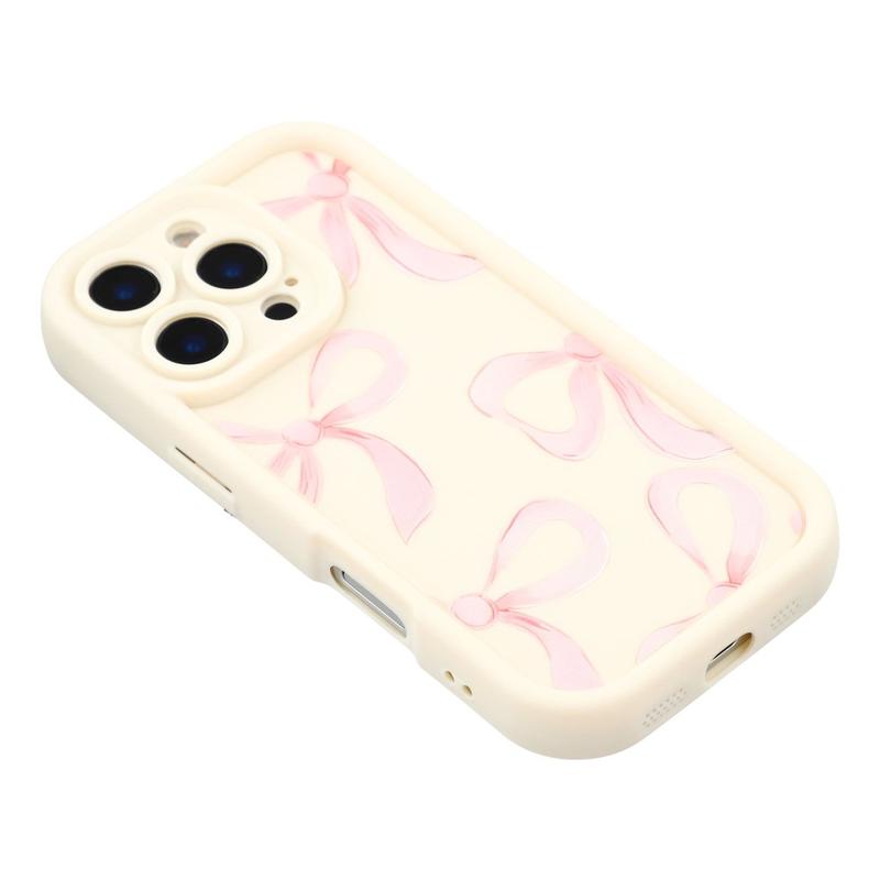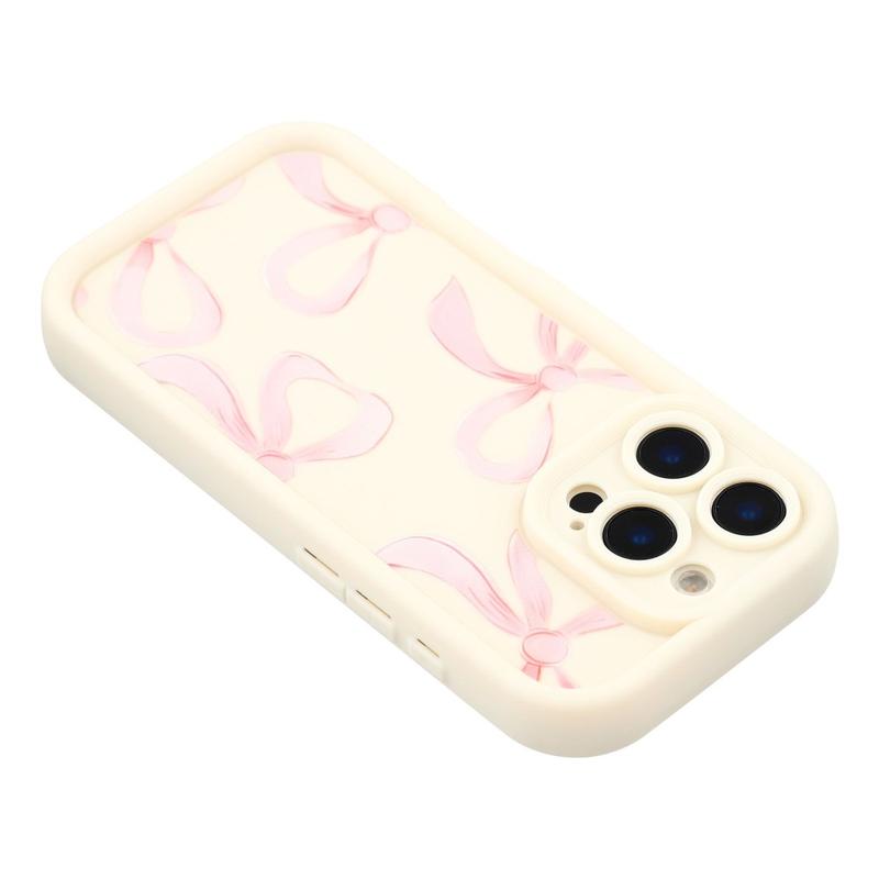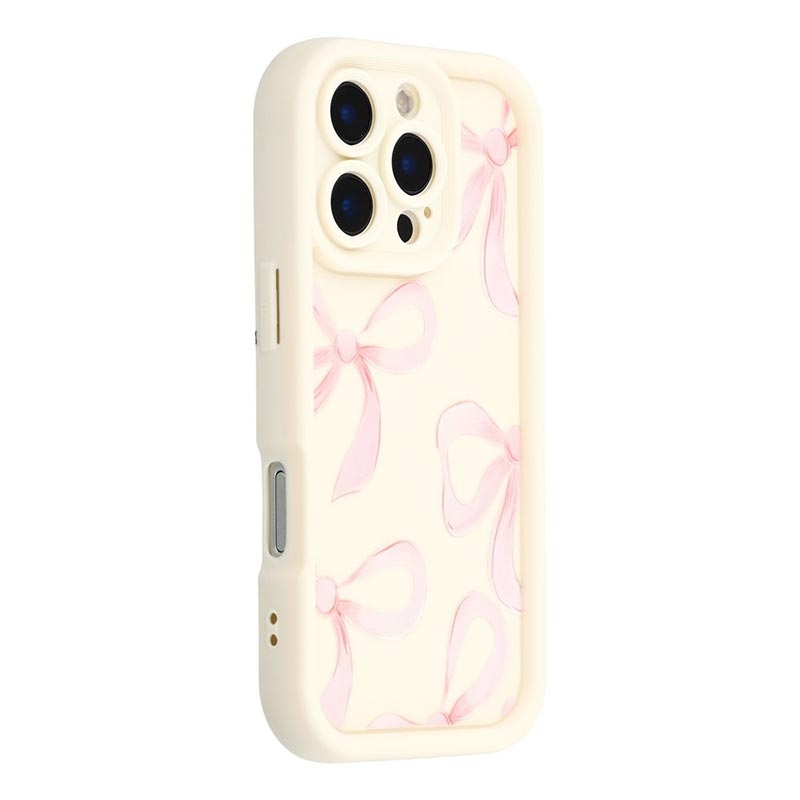 Elegante funda de TPU antichoque para iPhone 16 Pro Max con bordes elevados - Blanca / Lazo grande