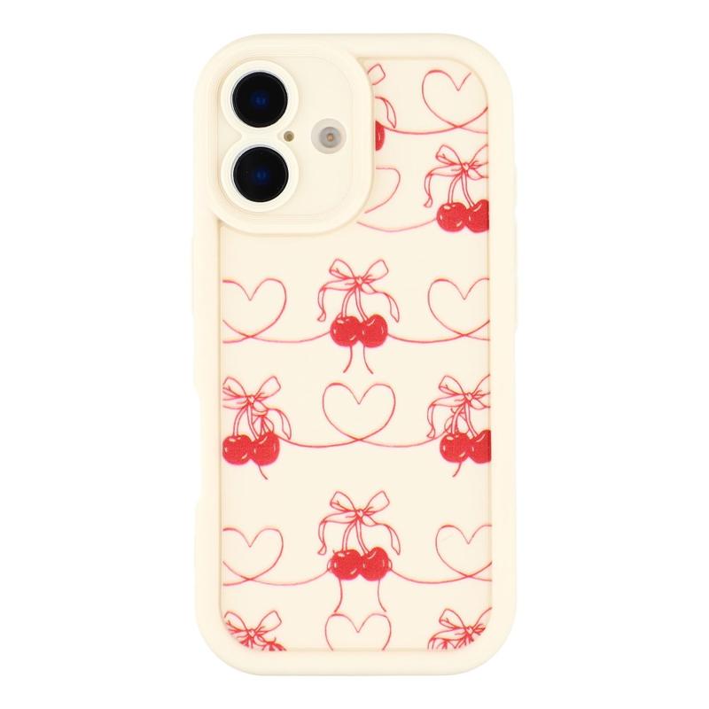 Elegante funda de TPU antichoque para iPhone 16 con bordes elevados - Blanco / Cerezas con lazo