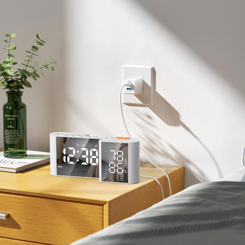 La pantalla LED dual de 6 pulgadas presenta dos paneles conectados para una información clara y fácil de leer. La superficie frontal espejada añade un aspecto de primera calidad, mientras que el cuerpo curvado en forma de S encaja perfectamente en cualquier dormitorio moderno, oficina o sala de estar.