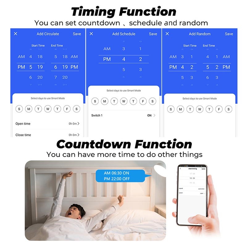 Crea rutinas personalizadas; por ejemplo, enciende el ventilador de la sala al amanecer o apaga automáticamente la luz nocturna de tu hijo a la hora de dormir. El temporizador de cuenta regresiva y la función "configurar y olvidar" te garantizan que nunca más tendrás que preocuparte por dejar los dispositivos encendidos.