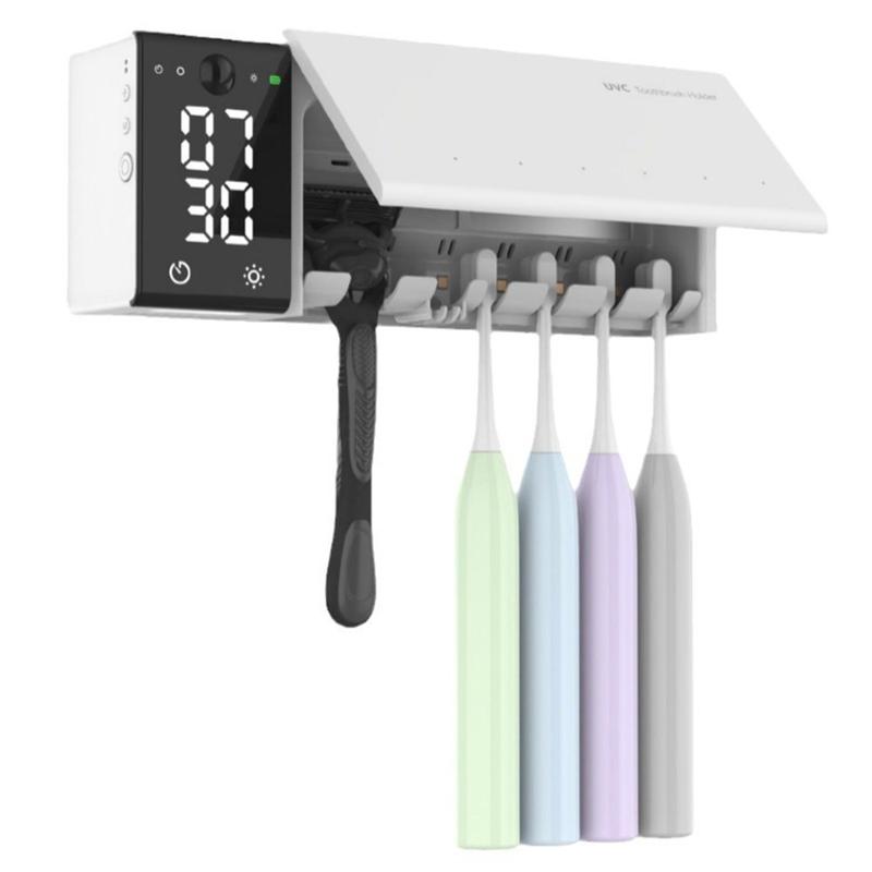 ES909 Desinfectante UV inteligente para cepillos de dientes - Soporte de pared para secado y esterilización con reloj LED, temporizador e instalación sin taladro