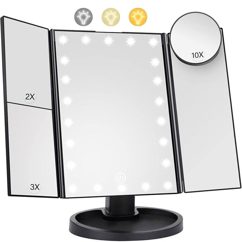 • Espejo de maquillaje plegable por 3 lados con 22 luces LED - Espejo de tocador con aumento 1X/2X/3X/10X