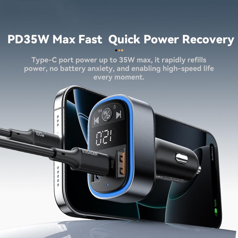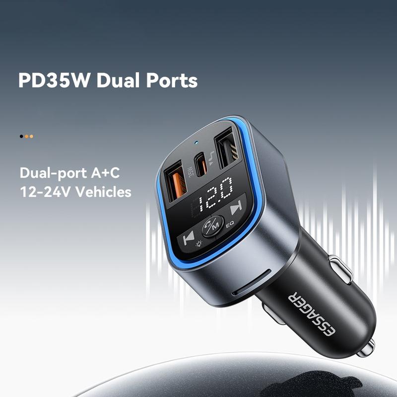 Essager ECCFM-CT0G-P Cargador de coche de carga rápida PD 35W con doble puerto USB-C/USB-A, transmisor FM Bluetooth 5.3 y micrófono para llamadas HD.