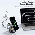 Despeja tu escritorio o mesilla de noche con el soporte magnético de carga inalámbrica 4 en 1 ESSAGER, diseñado para cargar simultáneamente tu smartphone, smartwatch, auriculares y un dispositivo adicional. Una solución compacta que mantiene tus dispositivos esenciales cargados y organizados en un solo lugar.
