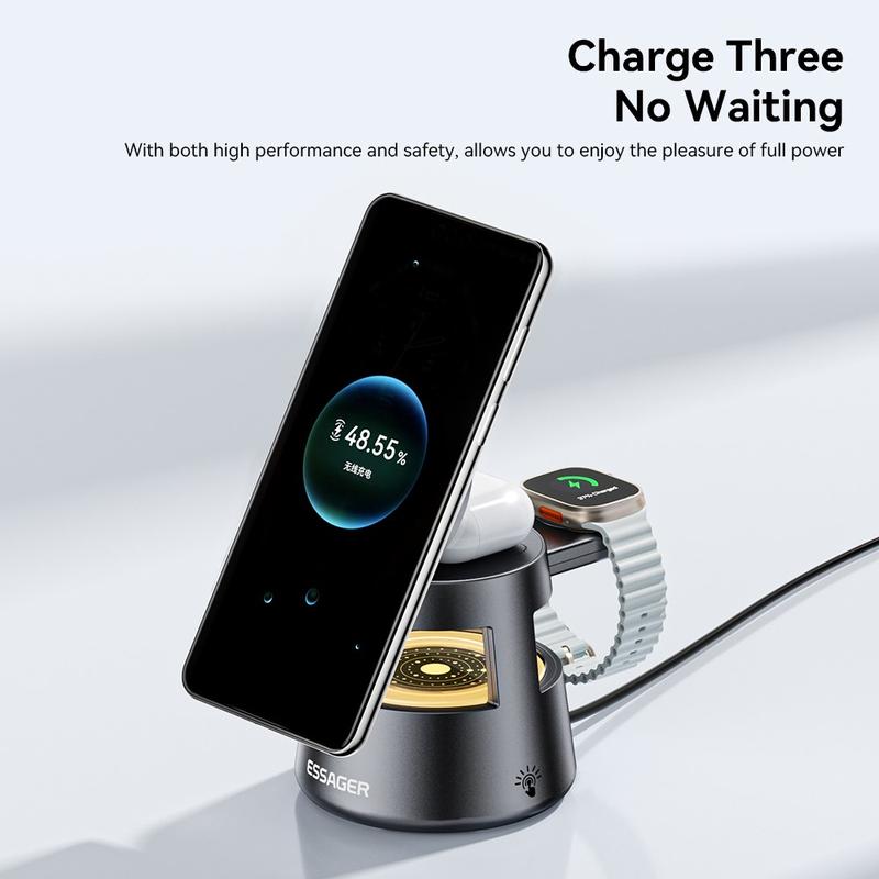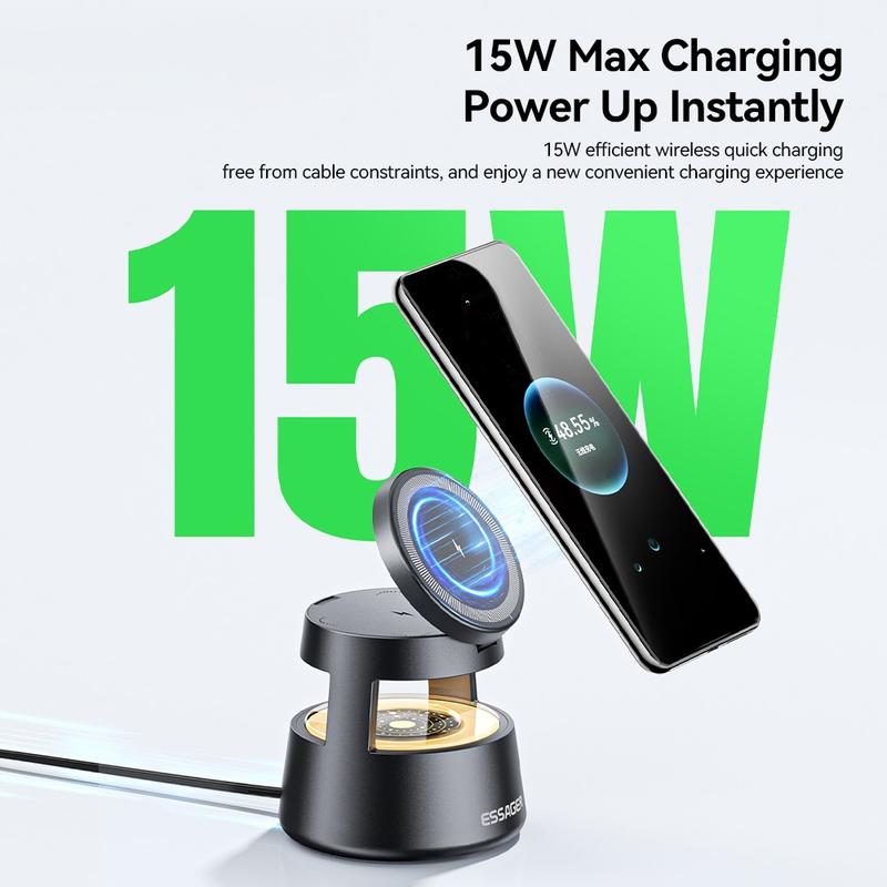 Este cargador 4 en 1 de ESSAGER combina carga rápida, estabilidad magnética, iluminación suave y compatibilidad con varios dispositivos en un único diseño que ahorra espacio, perfecto para el hogar, la oficina o la cabecera de la cama.