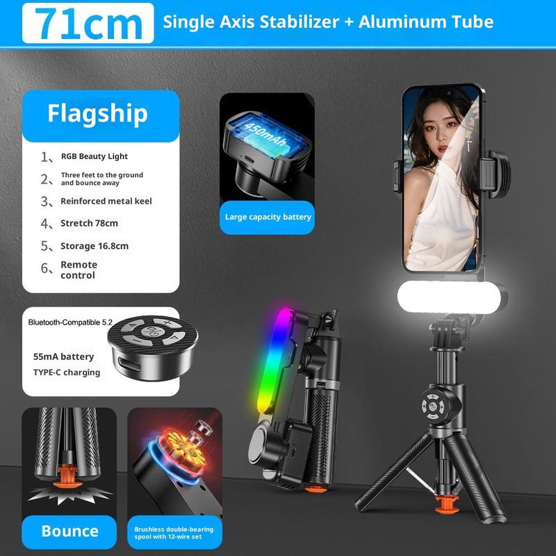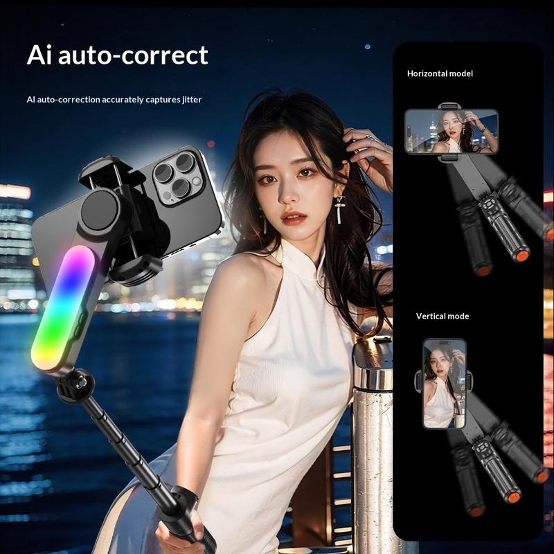 Estabilizador con cardán para palos selfies Q34 AI Anti-Shake: soporte extensible para móvil de 71 cm con luz de belleza RGB y mando a distancia