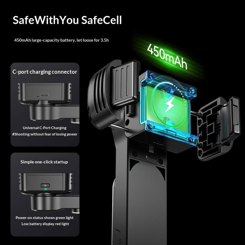 El Q34 utiliza una estructura de cardán de un solo eje con un motor sin escobillas para ayudar a compensar las vibraciones durante el uso con la cámara en mano. Su base de trípode plegable también permite una colocación más estable sobre superficies planas cuando se desea grabar o tomar fotos sin usar las manos. El dispositivo es compatible con teléfonos de 4,7 a 7 pulgadas, con un rango de anchura de sujeción de 65-90 mm, lo que lo hace adecuado para muchos smartphones dentro del rango de tamaño indicado.
