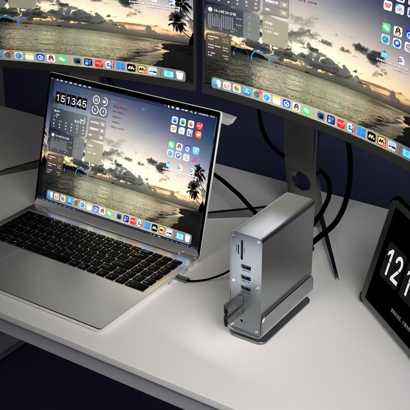 Convierta un único puerto USB-C en una estación de trabajo completa con esta estación de acoplamiento USB-C 15 en 1 con soporte integrado. Diseñada para portátiles y tabletas modernos, amplía su configuración con múltiples puertos USB, tres salidas de pantalla, Internet por cable rápido y lectores de tarjetas, ideal para oficinas domésticas, estudios creativos y flujos de trabajo de alta productividad. La carcasa totalmente metálica de aluminio le da un aspecto limpio a tu escritorio, ayuda a disipar el calor y el soporte integrado mantiene tu dispositivo en una posición ordenada para una mejor ergonomía.