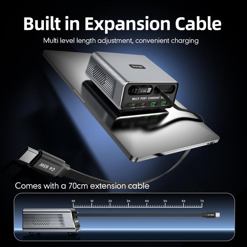- Diseño integrado de 6 puertos: 2 USB-C + 2 USB-A + 2 cables USB-C retráctiles