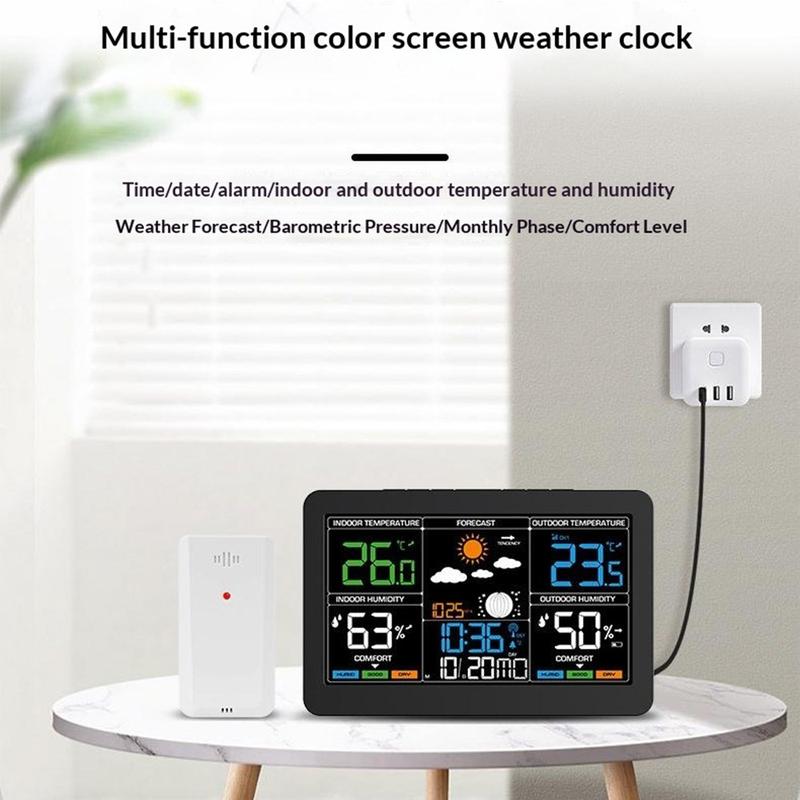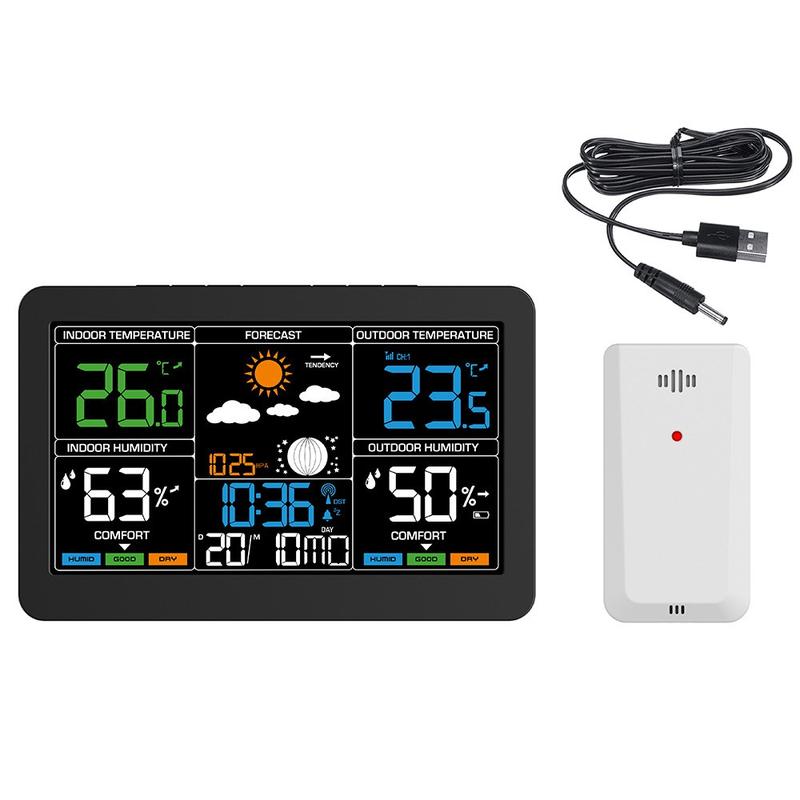 Estación meteorológica con gran pantalla a color, sensor exterior, termómetro, higrómetro y despertador