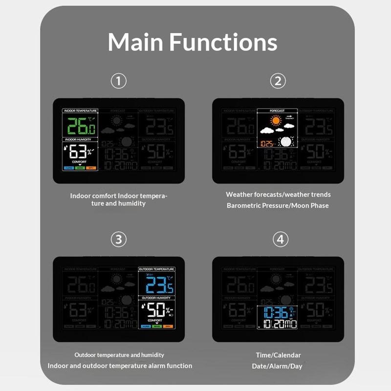 Este dispositivo también funciona como despertador con función de repetición, lo que lo hace práctico para usar junto a la cama o en el escritorio. Con opciones tanto de soporte de escritorio como de montaje en pared, se adapta a diferentes espacios según sus preferencias. La combinación de monitorización meteorológica y función de alarma lo convierte en un práctico dispositivo multifuncional para las rutinas diarias.