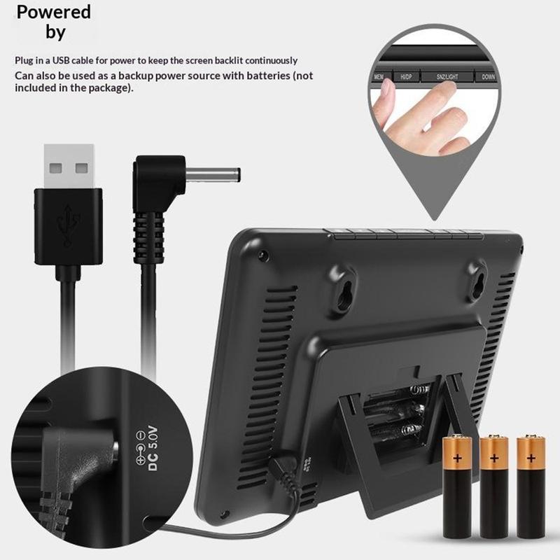 La estación meteorológica se puede alimentar a través de USB para un uso continuo de la pantalla y el funcionamiento de la retroiluminación, mientras que la batería de reserva ayuda a mantenerla operativa durante los cortes de corriente. Esta configuración de doble alimentación añade fiabilidad y flexibilidad, especialmente para los usuarios que desean una pantalla estable con soporte de respaldo adicional.