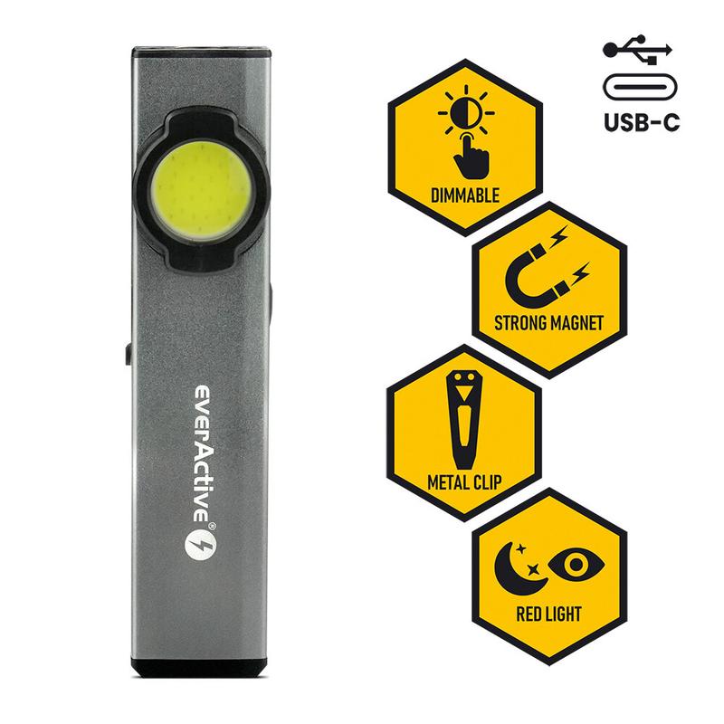 • EverActive WL-250R Linterna LED recargable para taller - 300 lúmenes, 4 modos, base magnética y clip