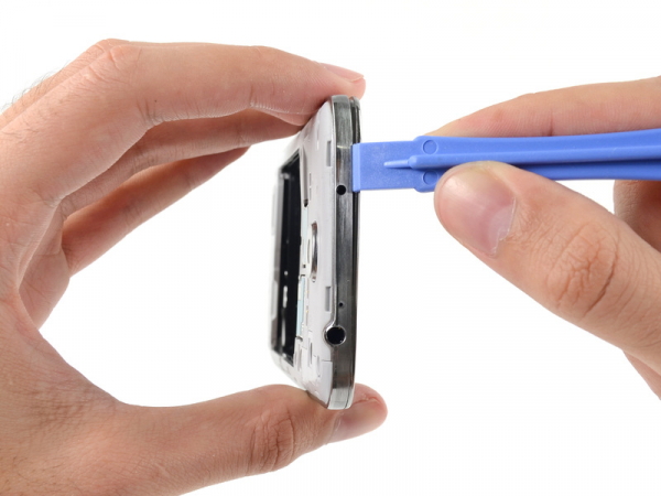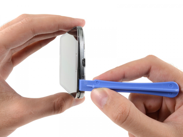 Empezando por el lado de donde se encuentra el botón de volumen del teléfono, inserte la herramienta de apertura de plástico entre el bisel cromado y el fondo de la pantalla de cristal.