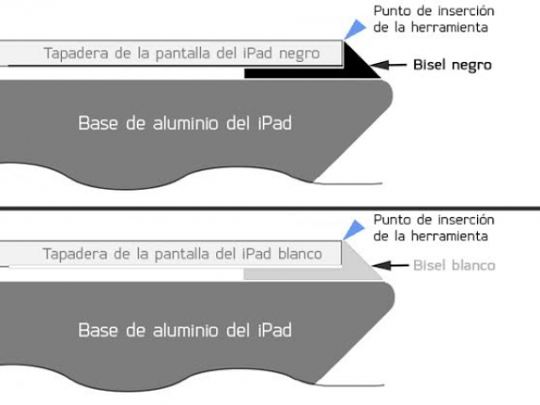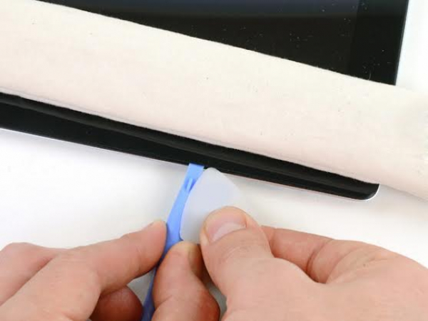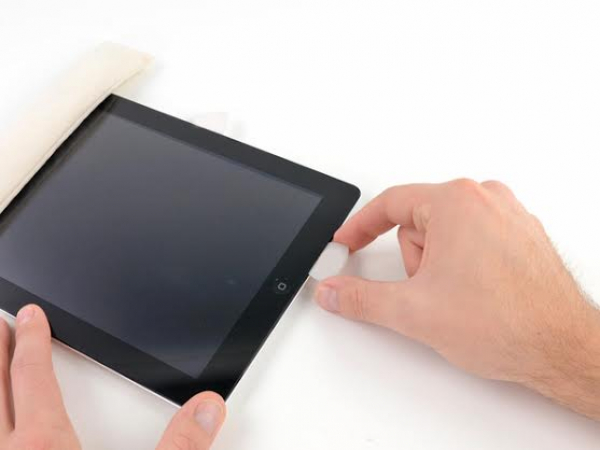 Puede pasar que se haya pegado de nuevo un poco de adhesivo a lo largo de los bordes del iPad. Si esto ocurre, mueva la púa debajo del borde del iPad en el punto donde el cristal delantero se ha fijado, y sepárelo del adhesivo.