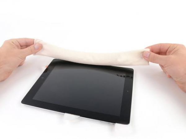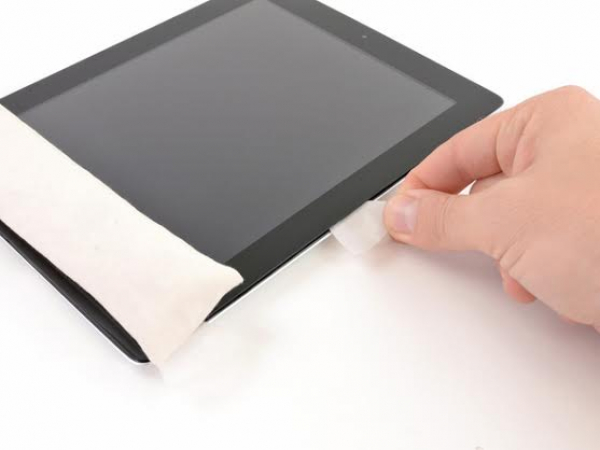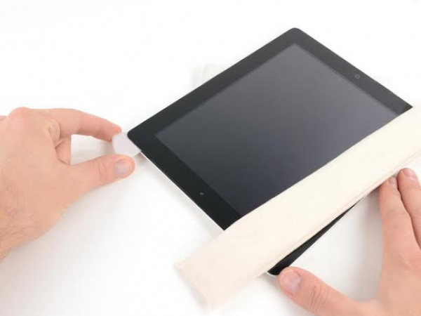 Deje que el iOpener caliente el borde inferior del iPad y comience la eliminación del adhesivo desde el borde derecho del iPad.