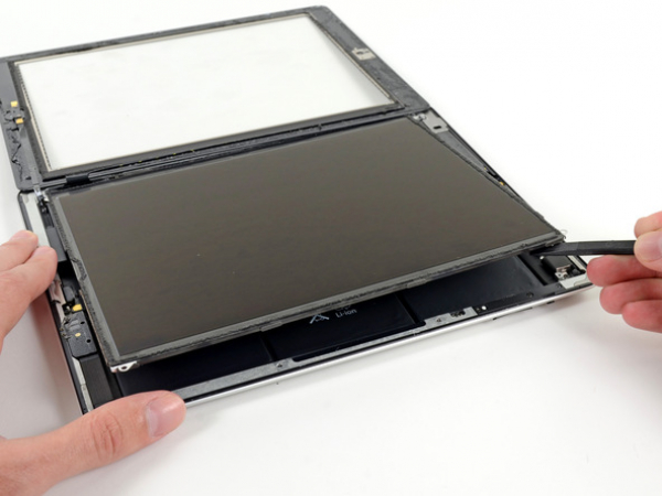 Levante el borde derecho de la pantalla LCD del iPad con una herramienta de apertura de plástico o un spudger.