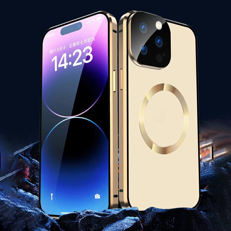 • Funda anti-caída de doble cara de vidrio templado + marco de metal magnético para iPhone 15 compatible con MagSafe Phone Cover con cierre de hebilla - Oro