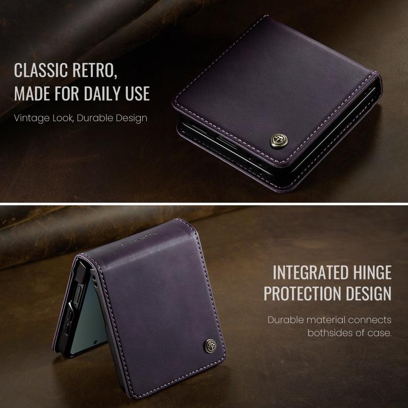 La funda CASEME 033 para Samsung Galaxy Z Flip7 está fabricada con poliuretano con textura de becerro combinado con TPU, lo que ofrece protección integral contra arañazos, impactos y el uso diario, manteniendo un aspecto elegante y de primera calidad.