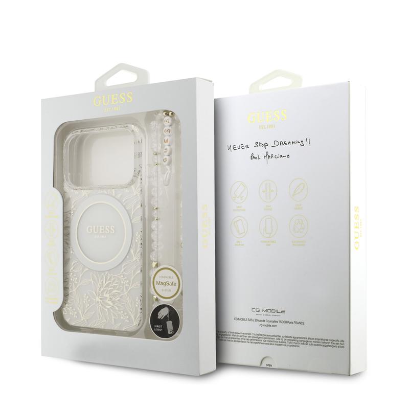 Funda con correa de perlas iPhone 17 Pro Guess IML Flowers Allover Electro - Compatible con MagSafe - Blanco