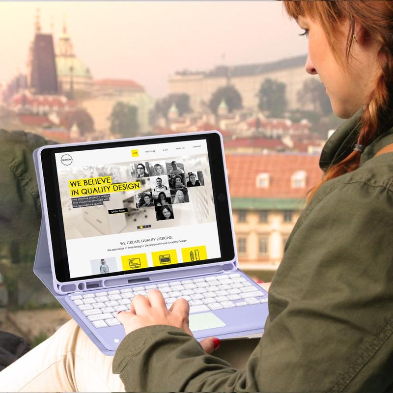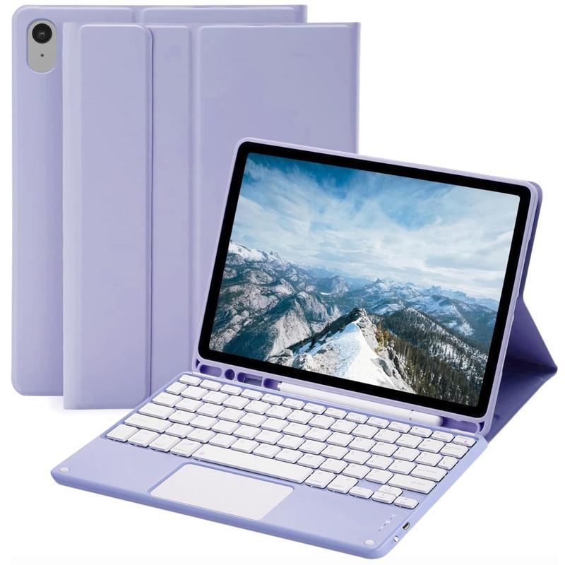 Mejora tu iPad Air 11 2026/2025/2024, iPad Air 2022/2020 con la funda con teclado Bluetooth, un accesorio multifunción 2 en 1 que combina protección, productividad y estilo. Fabricada en poliuretano de primera calidad, esta elegante funda ofrece protección total contra arañazos, golpes y huellas dactilares, al tiempo que mantiene un aspecto profesional. El teclado Bluetooth se conecta de forma inalámbrica para una escritura fluida y con gran capacidad de respuesta, mientras que el panel táctil integrado admite el control multigestual para una navegación sin esfuerzo. El teclado retroiluminado permite escribir cómodamente incluso en entornos con poca luz. El soporte ajustable integrado ofrece un ángulo de visión ergonómico, por lo que es perfecto para escribir, transmitir o leer. Diseñada para los negocios, los viajes o el uso diario, esta funda con teclado transforma la tableta en una estación de trabajo portátil.