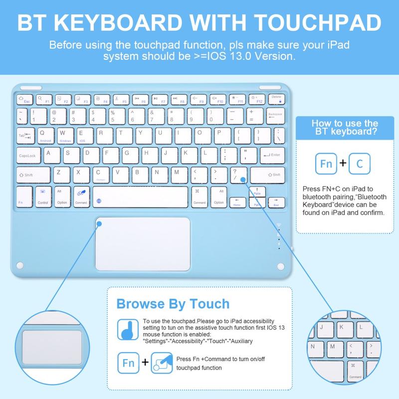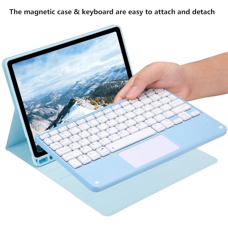 Mejora tu iPad Air 11 2026/2025/2024, iPad Air 2022/2020 con la funda con teclado Bluetooth, un accesorio multifunción 2 en 1 que combina protección, productividad y estilo. Fabricada en poliuretano de primera calidad, esta elegante funda ofrece protección total contra arañazos, golpes y huellas dactilares, al tiempo que mantiene un aspecto profesional. El teclado Bluetooth se conecta de forma inalámbrica para una escritura fluida y con gran capacidad de respuesta, mientras que el panel táctil integrado admite el control multigestual para una navegación sin esfuerzo. El teclado retroiluminado permite escribir cómodamente incluso en entornos con poca luz. El soporte ajustable integrado ofrece un ángulo de visión ergonómico, por lo que es perfecto para escribir, transmitir o leer. Diseñada para los negocios, los viajes o el uso diario, esta funda con teclado transforma la tableta en una estación de trabajo portátil.