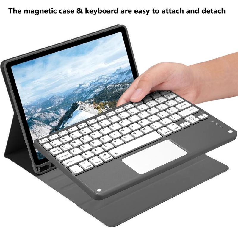 Mejora tu iPad Air 11 2026/2025/2024, iPad Air 2022/2020 con la funda con teclado Bluetooth, un accesorio multifunción 2 en 1 que combina protección, productividad y estilo. Fabricada en poliuretano de primera calidad, esta elegante funda ofrece protección total contra arañazos, golpes y huellas dactilares, al tiempo que mantiene un aspecto profesional. El teclado Bluetooth se conecta de forma inalámbrica para una escritura fluida y con gran capacidad de respuesta, mientras que el panel táctil integrado admite el control multigestual para una navegación sin esfuerzo. El teclado retroiluminado permite escribir cómodamente incluso en entornos con poca luz. El soporte ajustable integrado ofrece un ángulo de visión ergonómico, por lo que es perfecto para escribir, transmitir o leer. Diseñada para los negocios, los viajes o el uso diario, esta funda con teclado transforma la tableta en una estación de trabajo portátil.