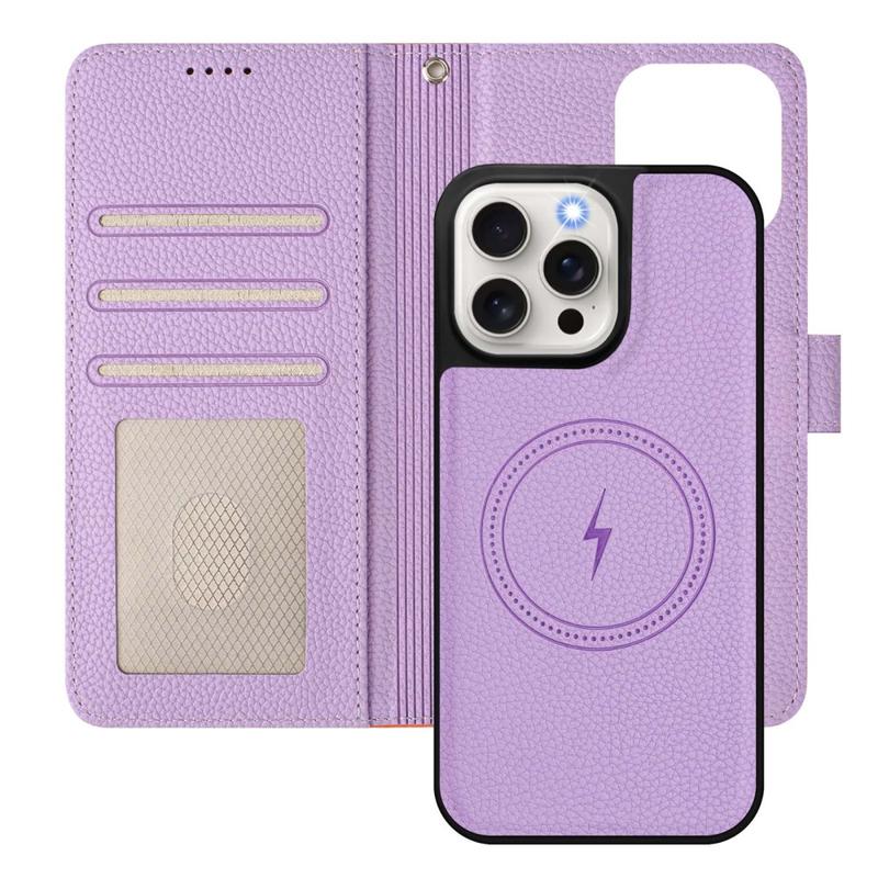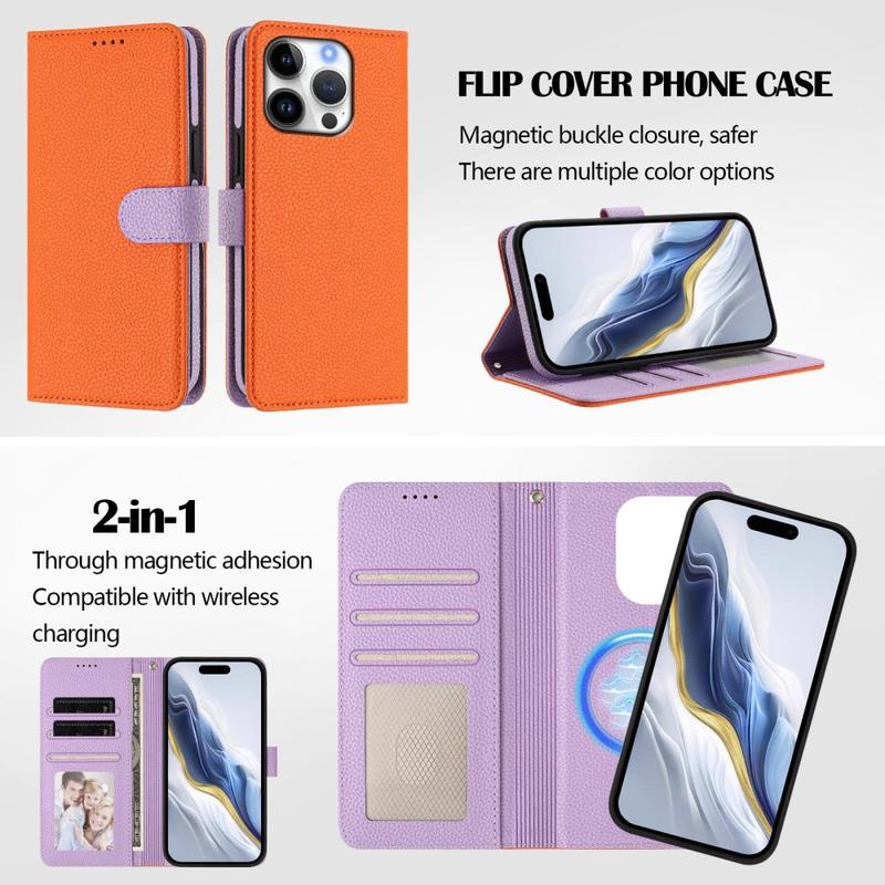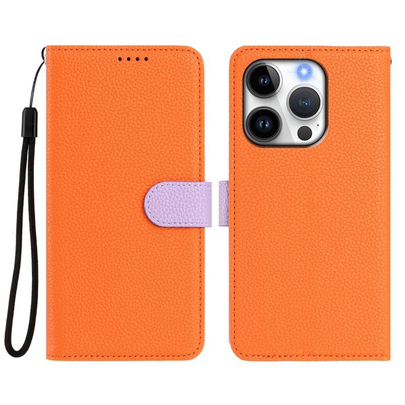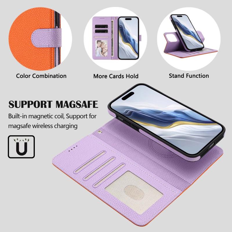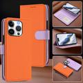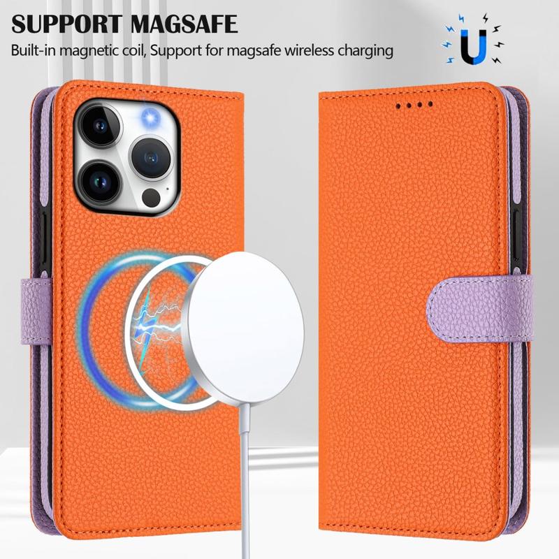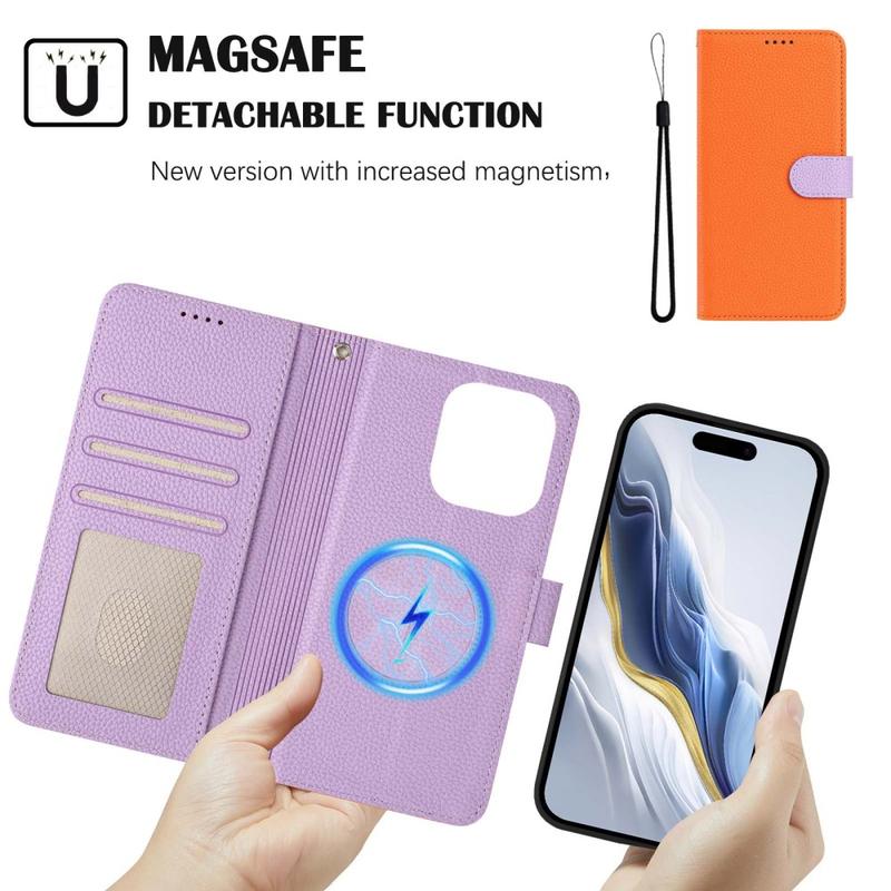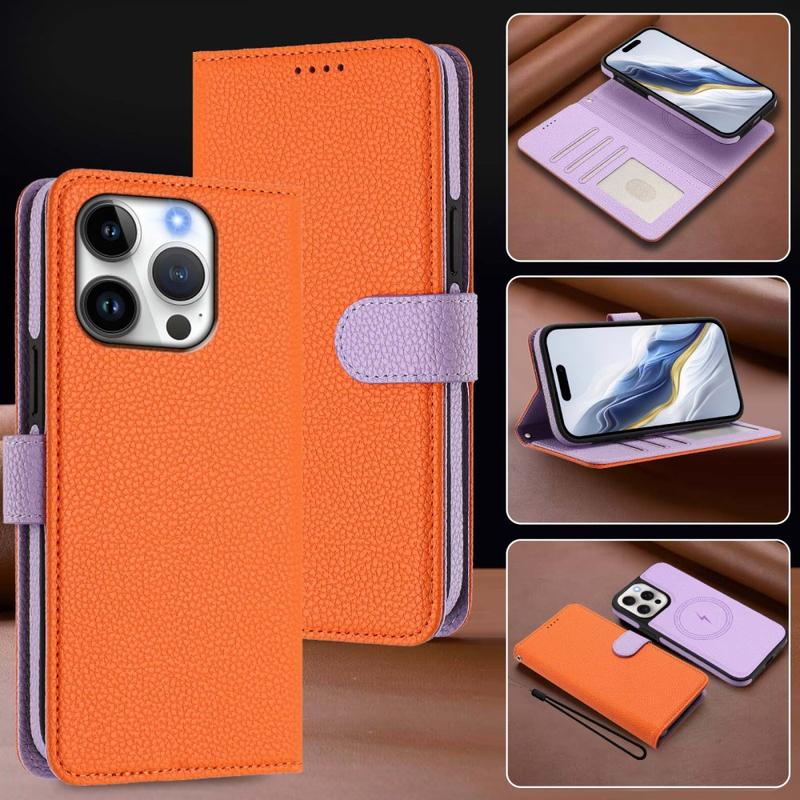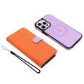 Funda de cartera extraíble para iPhone 16 Pro con MagSafe, protección RFID y correa de mano - Naranja / Morado