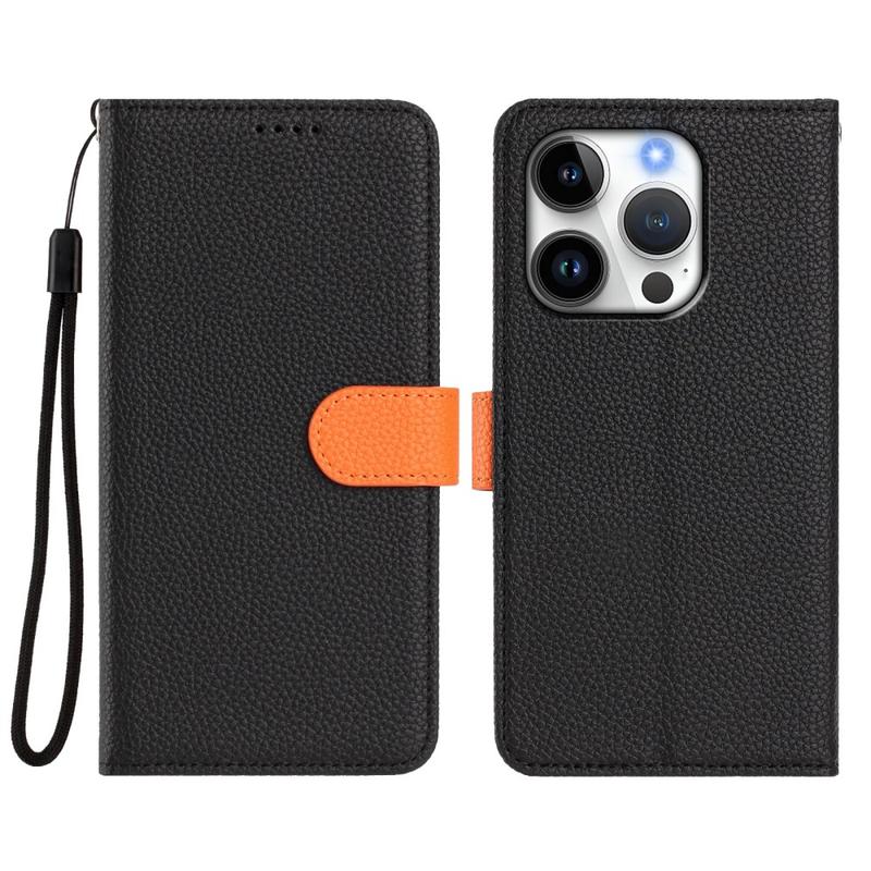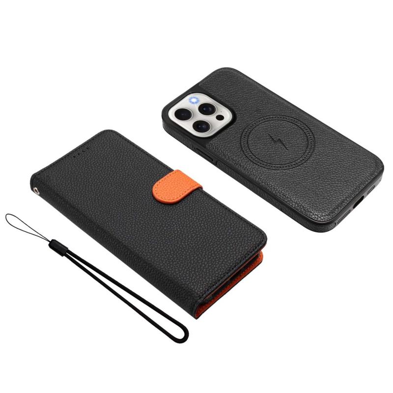 Funda de cartera desmontable para iPhone 16 Pro con MagSafe, protección RFID y correa de mano - Negro / Naranja