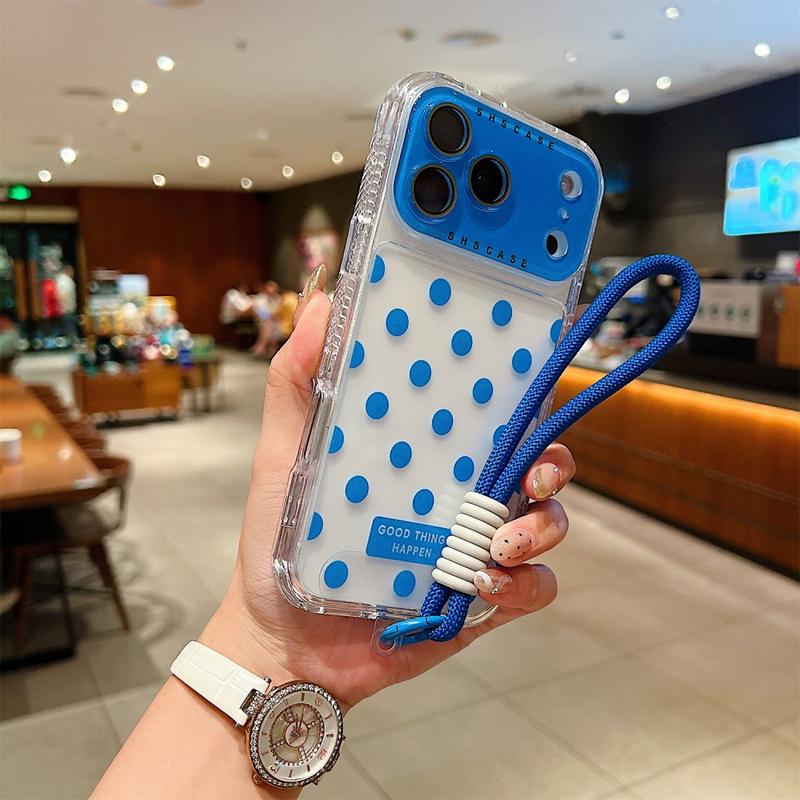Funda de PC/TPU para iPhone 17 Pro Max con película para lente y correa - Lunares - Azul