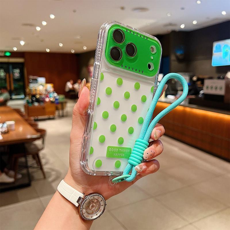 Funda de PC/TPU para iPhone 17 Pro Max con película para lente y correa - Lunares - Verde