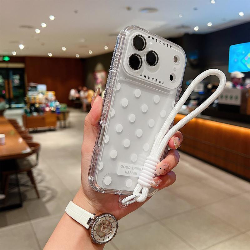 - Especificaciones - Material: TPU + PC | Compatibilidad: iPhone 17 Pro | Estilo: Transparente con lunares | Accesorios: Funda + Película para lente + Correa.