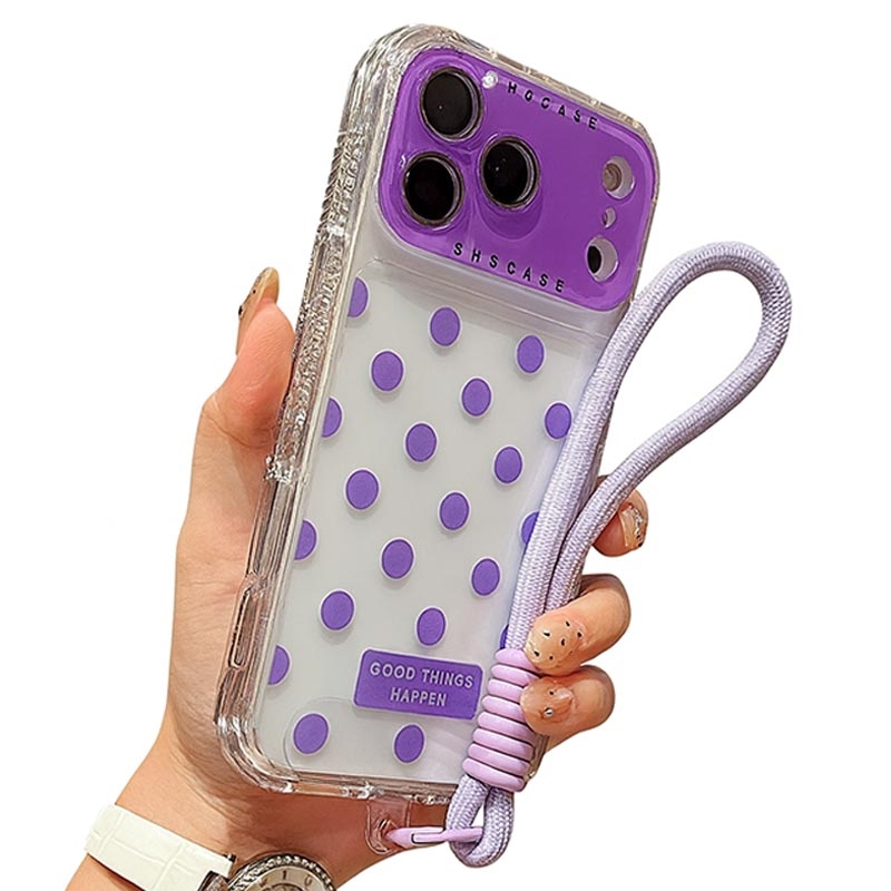Funda de PC/TPU para iPhone 17 Pro con película para lente y correa - Lunares - Morado